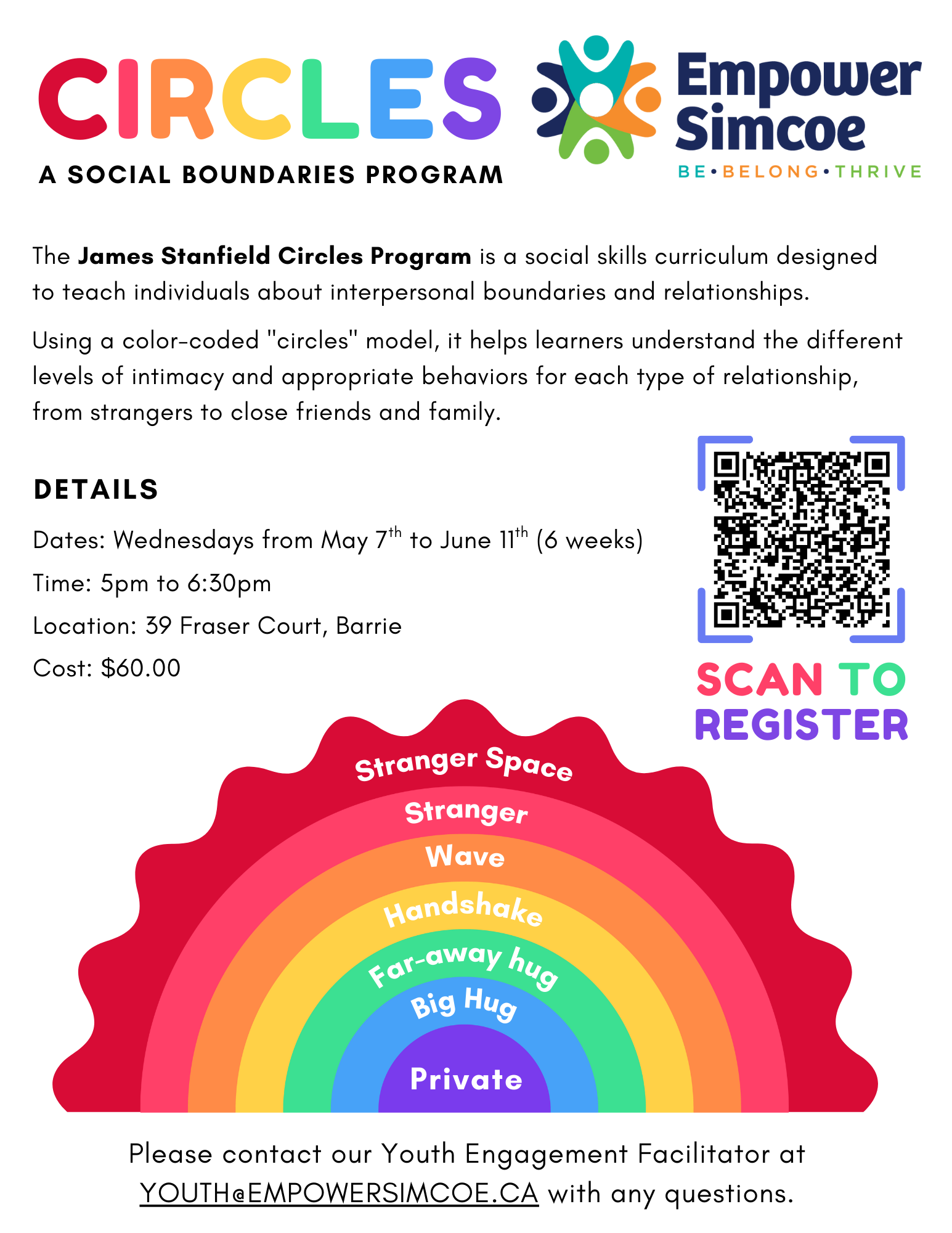 Empower Simcoe’s Circles Program is a 6-week after-school series designed to help youth explore and understand social boundaries and healthy relationships in a fun, supportive environment. Using a simple, colour-coded model, participants learn to recognize the different “circles” of relationships—from strangers to close friends and family—and the appropriate behaviours that go along with each.
